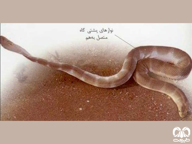 طول کل بدن این مار 120 سانتیمتر و طول دم آن 13 سانتیمتر است. سطح پشتی زیتونی مایل به مشکی و به همراه نوارهای مشکی عرضی است. این نوارها در دو سمت از ضخامت کمتری برخوردارند. همچنین یک یا چند ردیف از خالهای تیره رنگ نیز در سطح پشتی دیده میشوند. نوارهای پشتی گاهی به یکدیگر متصل میگردند. سطح شکمی سفید یا خاکستری کمرنگ است. پولکهای سطح پشتی در ضخیمترین ناحیه بدن به شکل پنج ، شش یا چهار وجهی هستند. دارای همپوشانی مختصر بوده و یا در کنار هم قرار گرفته و در پهنترین قسمت بدن در 33 تا 55 ردیف طولی آرایش یافتهاند. این پولکها در قسمت میانی خود دارای برجستگیهای زگیل مانند یا اندکی تیغه هستند. در فک بالا 10 تا 13 دندان قرار گرفته. دو پولک گیجگاهی قدامی دارد. پولکهای سطح شکمی 209 تا 312 عدد هستند.