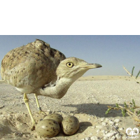 Biological characteristics: Prefers arid steppes, open plains of deserts and semi-deserts, sand dunes, and stony or rocky regions with sparse bushes. Gregarious outside breeding season, occurring in small flocks of 4-10 birds. Flight fast with slow heavy wing-beats. Usually prefers walking rather than flying. Walks slowly with dignity and is able to run fast (about 40 km/h). When in danger, conceals among bushes or presses itself to ground. Omnivorous. Feeds on flowers, fruits, seeds, leaves as well as insects, snakes, and lizards. Breeding starts early March to early April. Monogamous. Nest a shallow depression without lining, built in sandy or stony region with sparse bushes. Usual clutch 2-3, seldom 4, short oval to semioval light olive-brown eggs mottled brown, reddish brown, and grey, 62.2 × 45 mm in size. Eggs hatch after 28 days. Chicks precocial and nidifugous. Nutritionally dependent on parents for one week. Fledging period 35 days, but still remaining with female parent until autumn.
