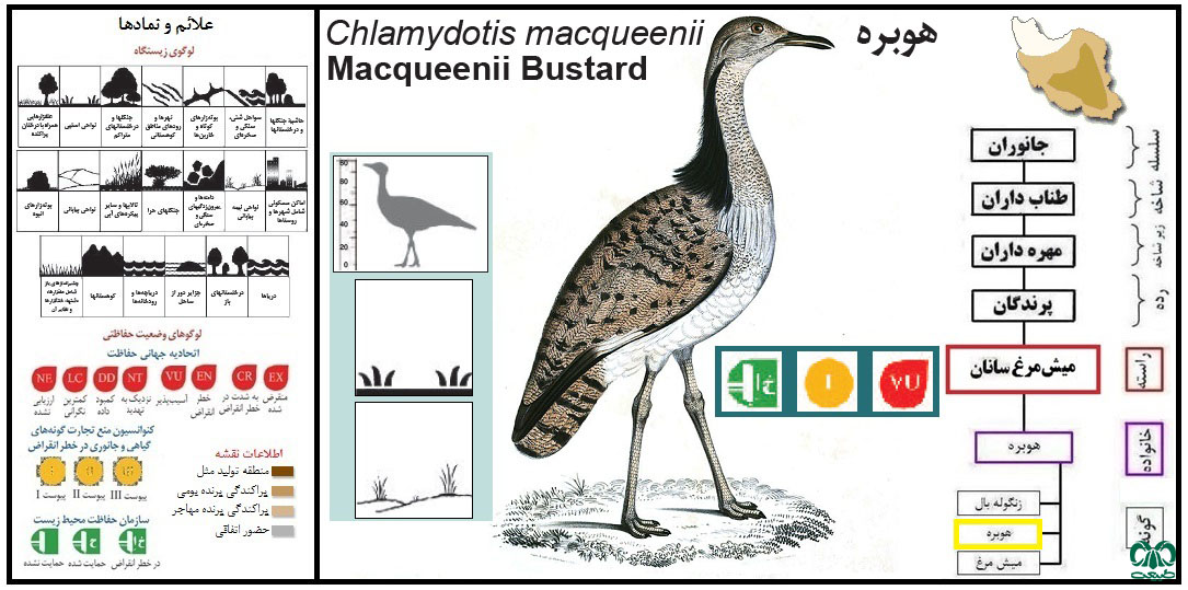 Distribution and abundance: A rather scarce but widely distributed breeding bird occurring in well-vegetated deserts around the central desert basins of Iran. Also a fairly common winter visitor to southern lowlands of Khuzestan to Sistan- Baluchestan, southern Fars, and Hormozgan. Recorded on passage in north-eastern Khorasan and Mazandaran (Miankaleh Peninsula). This species was formerly considered to be a sub-species of the Houbara Bustard Chlamydotis undulata.